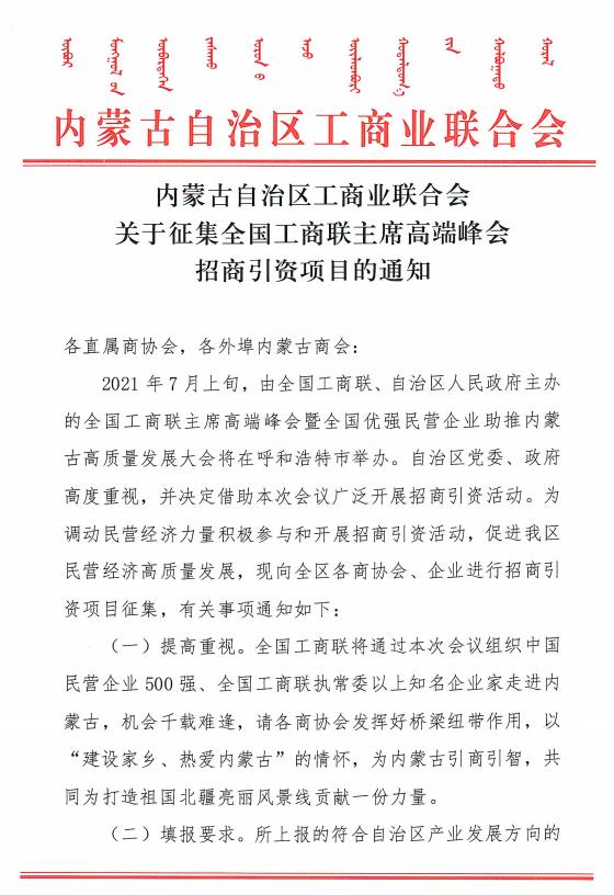 內蒙古自治區工商業(yè)聯(lián)合會(huì )關(guān)于征集全國工商聯(lián)主席高端峰會(huì )招商引資項目的通知
