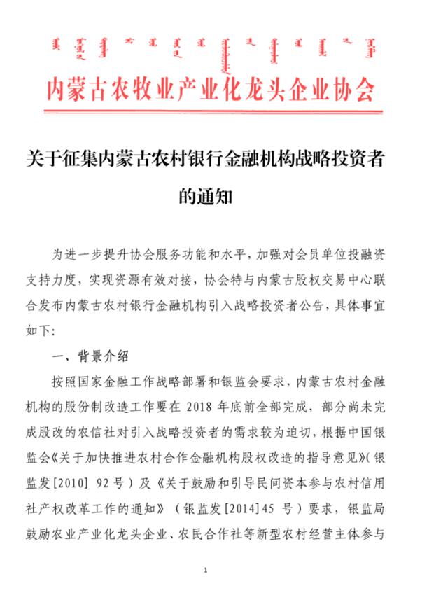 關(guān)于征集內蒙古農村銀行金融機構戰略投資者的通知
