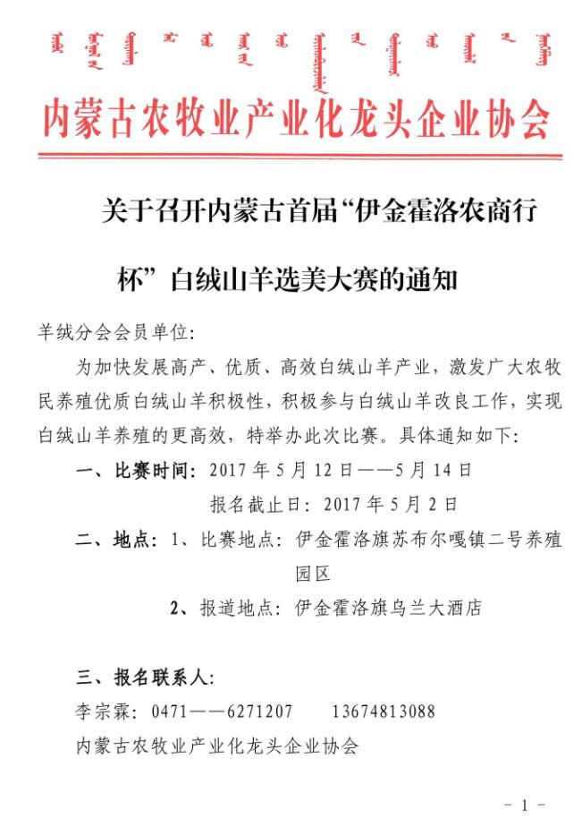 關(guān)于召開(kāi)內蒙古首屆“伊金霍洛農商行杯”白絨山羊選美大賽的通知