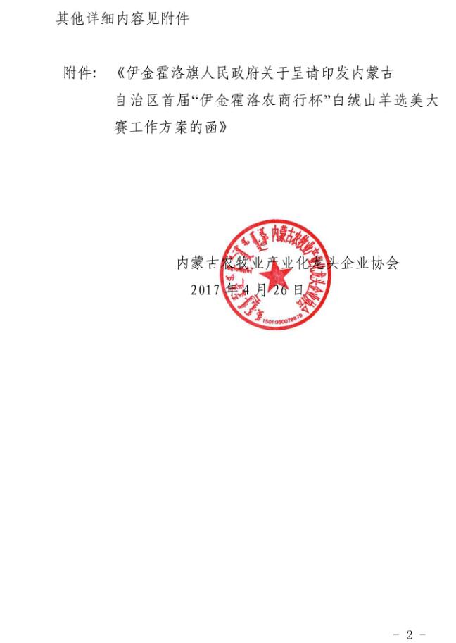 伊政函【2017】64號關(guān)于呈請印發(fā)內蒙古自治區首屆“伊金霍洛農商行杯”白絨山羊選美大賽工作方案的函